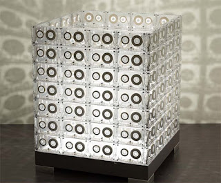 Espero que gostem da idéia. Aqui, uma luminária feita de fitas cassete.